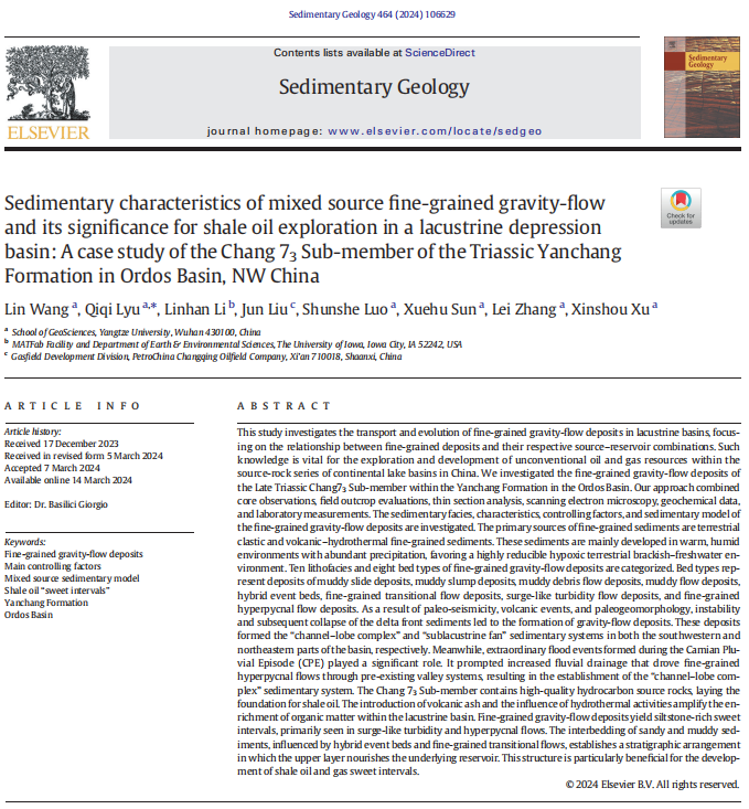 地科公司硕士生王林在《Sedimentary Geology》发表题为“Sedimentary characteristics of mixed source fine-grained gravity-flow and its significance for shale oil exploration in a lacustrine depression basin: A case study of the Chang 73Sub-member of the Triassic Yanchang Formation in Ordos Basin, NW China”的研究论文。英国365集团公司官网为论文第一署名单位,硕士生王林为论文第一作者,教师吕奇奇为通讯作者。