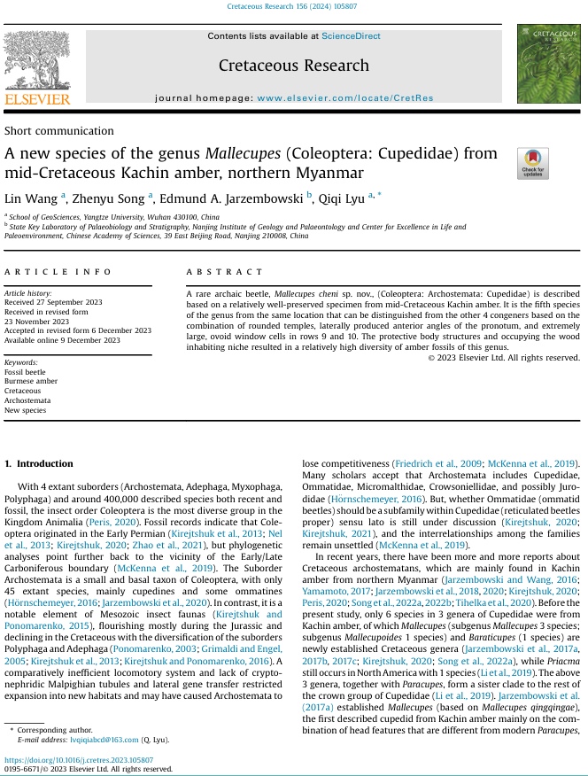 地科公司硕士研究生王林同学在公司吕奇奇、宋振宇两位老师共同指导下,在地球科学与古生物学领域期刊《Cretaceous Research》上发表题为“A new species of the genusMallecupes(Coleoptera: Cupedidae) from mid-Cretaceous Kachin amber, northern Myanmar”的研究论文。