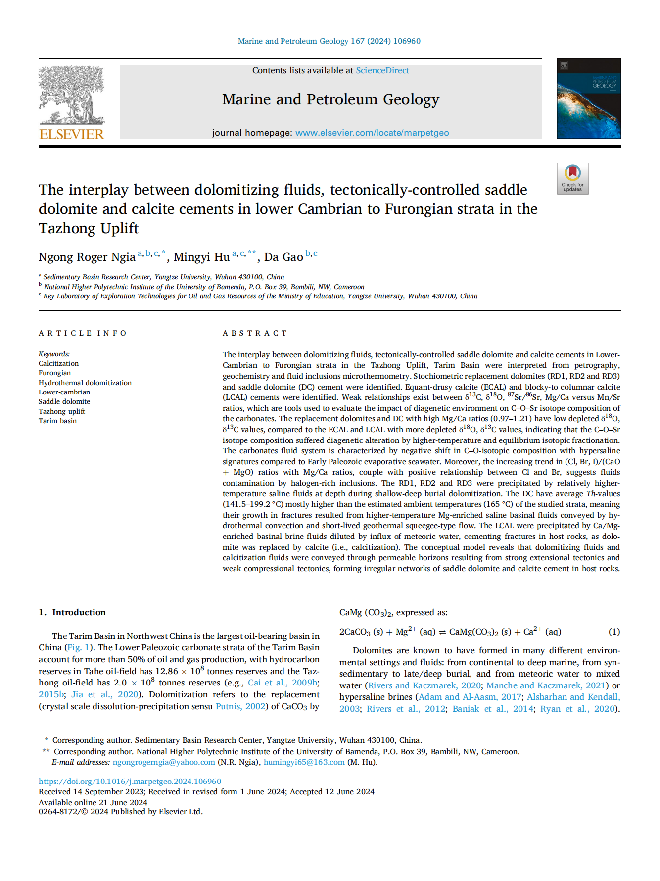 地科公司胡明毅教授团队在石油地质领域主流期刊《Marine and Petroleum Geology》发表了题为“The interplay between dolomitizing fluids, tectonically-controlled saddle dolomite and calcite cements in lower Cambrian to Furongian strata in the Tazhong Uplift”的研究论文。