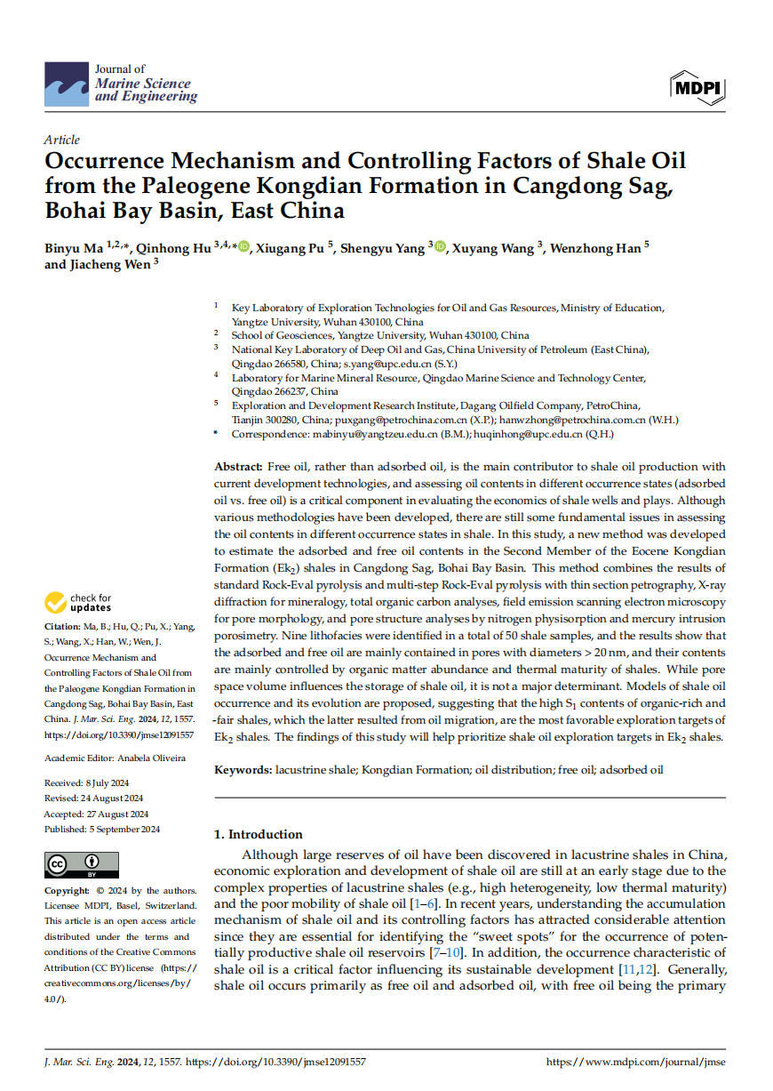 英国365集团公司官网地质系马斌玉博士以第一作者身份在海洋地质学领域主流期刊《Journal of Marine Science and Engineering》(JMSE)上发表题为“Occurrence Mechanism and Controlling Factors of Shale Oilfrom the Paleogene Kongdian Formation in Cangdong Sag,Bohai Bay Basin, East China”的研究论文,该项研究得到了国家自然科学基金、中国博士后基金和油气资源与勘探技术教育部重点实验室开放基金的资助。