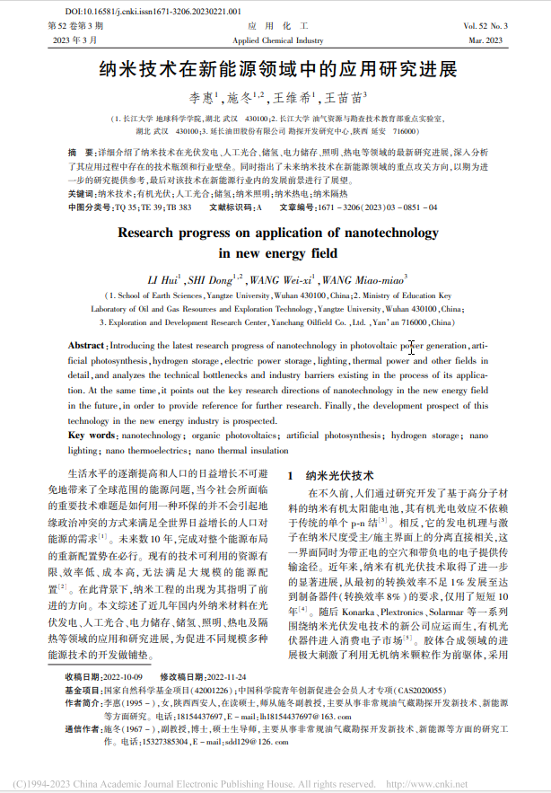 公司硕士生李惠在中文期刊《应用化工》上发表了题为“纳米技术在新能源领域中的应用研究进展”的研究论文。英国365集团公司官网为论文第一署名单位,研究生李惠为论文第一作者,教师施冬为通讯作者。