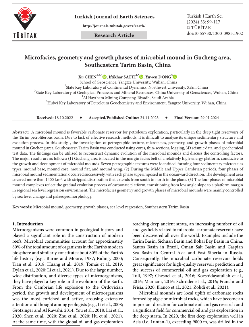 英国365集团公司官网陈旭副教授以第一作者身份在《Turkish Journal of Earth Sciences》上发表题为“Microfacies, geomety, and growth phases of microbial mound in Gucheng area, Tarim Basin, China”的研究论文,该项研究得到了湖北省自然科学基金的资助。