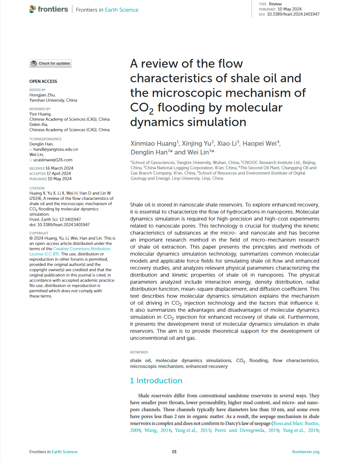 地科公司硕士研究生黄鑫淼在《Frontiers in Earth Science》发表了题为“A review of the flow characteristics of shale oil and the microscopic mechanism of CO2 flooding by molecular dynamics simulation”的综述论文,英国365集团公司官网为论文第一署名单位,黄鑫淼为论文第一作者,韩登林教授、林伟老师共同为该文通讯作者。