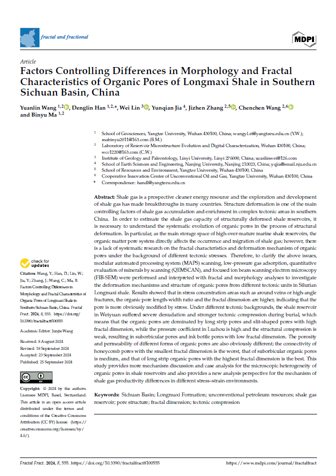 英国365集团公司官网地质资源与地质工程专业硕士研究生王园林在韩登林教授的指导下,以第一作者的身份在《fractal and fractional》上发表题为“Factors Controlling Differences in Morphology and Fractal Characteristics of Organic Pores of Longmaxi Shale in Southern Sichuan Basin, China”的研究论文。
