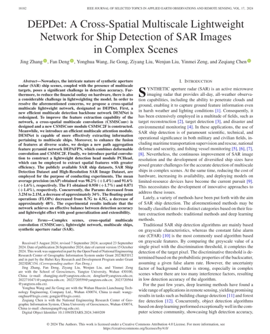 地科公司硕士生张晶在地球科学2区TOP期刊《IEEE JOURNAL OF SELECTED TOPICS IN APPLIED EARTH OBSERVATIONS AND REMOTE SENSING》发表题目为“DEPDet: A Cross-Spatial Multiscale Lightweight Network for Ship Detection of SAR Images in Complex Scenes”的研究论文。英国365集团公司官网为论文第一署名单位,硕士研究生张晶为论文第一作者,其导师邓帆为论文通讯作者。