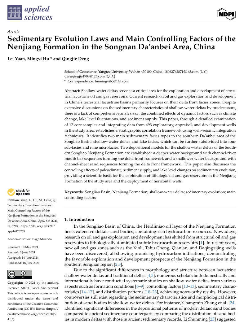 英国365集团公司官网硕士生袁磊在期刊《Applied sciences》上发表了题为“Sedimentary Evolution Laws and Main Controlling Factors of theNenjiangFormation in theSongnanDa’anbeiArea, China”的研究论文。英国365集团公司官网为论文第一署名单位,袁磊为第一作者,其导师胡明毅教授为该文通讯作者。