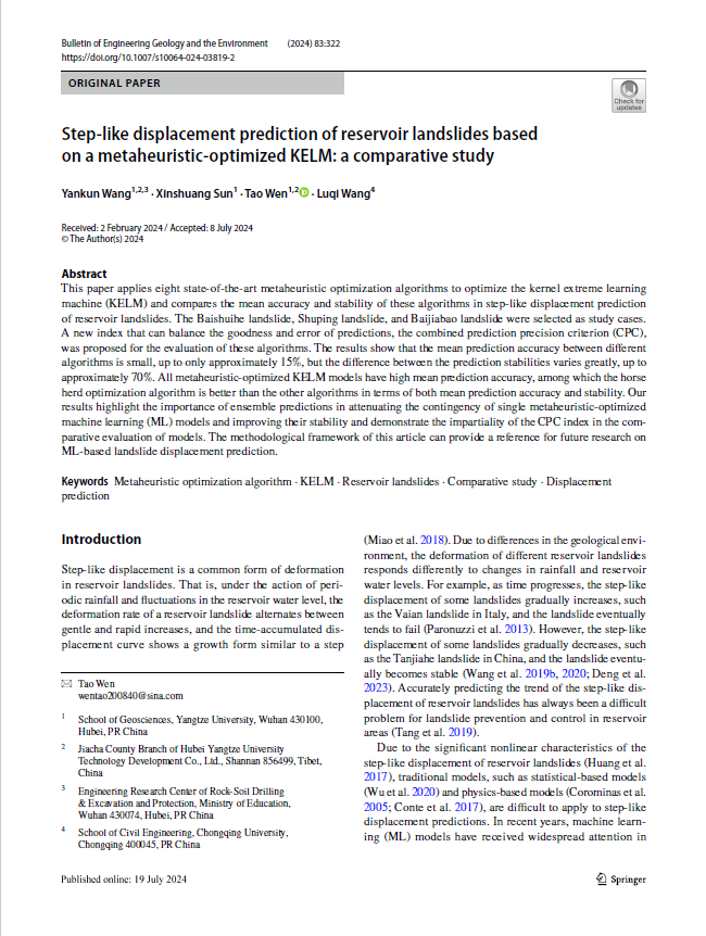 地科公司教师王艳昆副教授以第一作者身份在2区SCI期刊《Bulletin of Engineering Geology and the Environment》发表题为《Step-like displacement prediction of reservoir landslides based on a metaheuristic-optimized KELM: a comparative study》的研究论文。英国365集团公司官网为论文的第一署名单位,地质(工程)22001班本科生孙新爽为该文第二作者,温韬副教授为该文通讯作者,本项研究得到国家自然科学基金项目、湖北省自然科学基金项目、西藏自治区科技计划项目、青海省科技计划项目和老员工创新创业训练计划项目共同资助。