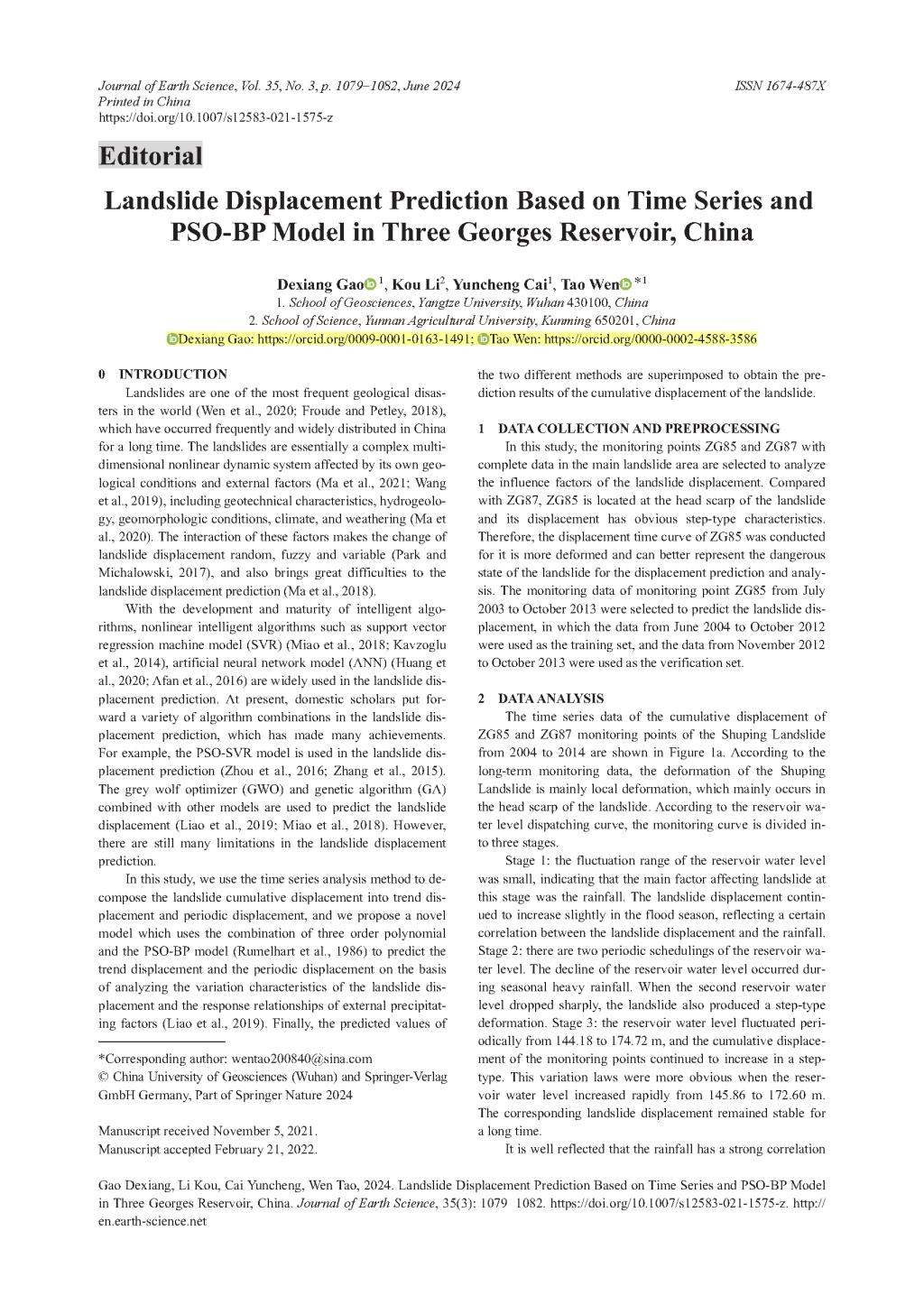 地科公司温韬副教授团队长期从事极端条件下滑坡灾害演化机理、预测及防治方面的研究,指导本科生高德祥在综合性地学学术2区期刊《Journal of Earth Science》上发表题为“Landslide Displacement Prediction Based on Time Series and PSO-BP Model in Three Georges Reservoir, China”的研究论文。英国365集团公司官网为论文第一署名单位,本科生高德祥为论文第一作者,温韬副教授为该文通讯作者,本项研究得到国家自然科学基金项目、非常规油气协同创新中心、湖北省爆破工程重点实验室开放基金项目共同资助。