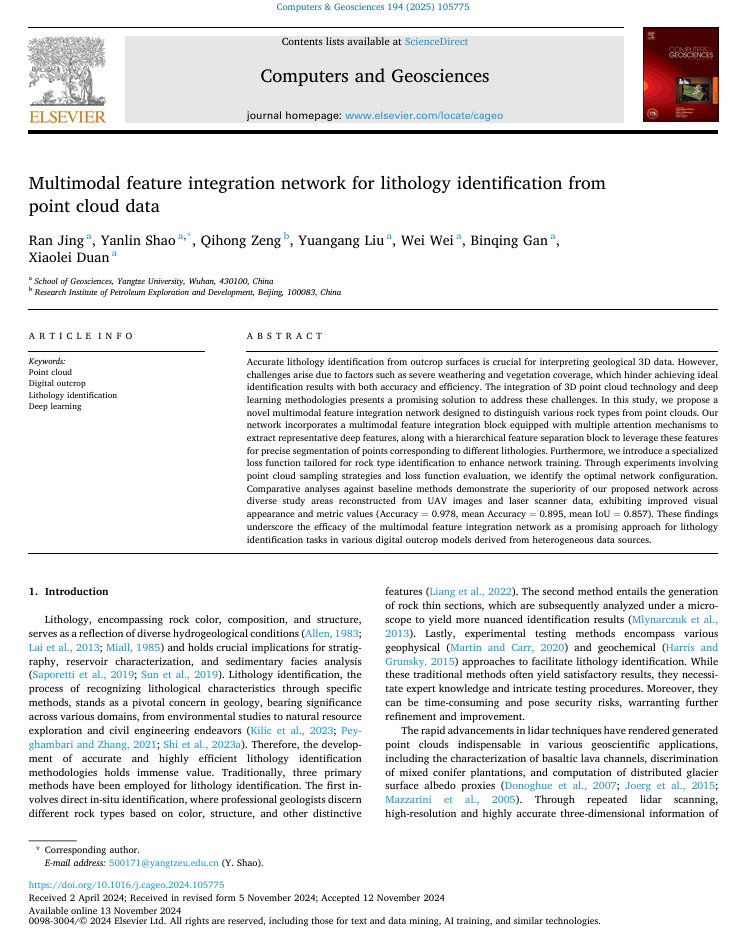 公司教师井然博士在国际学术期刊《Computers & Geosciences》上发表了题为“Multimodal feature integration network for lithology identification from point cloud data“的SCI论文,提出了一种基于多模态特征融合的三维露头点云岩性识别方法。该研究不仅在方法上具有创新性,而且在实际应用中有较好的性能表现,为地质露头点云的岩性判别提供了新的技术路径。