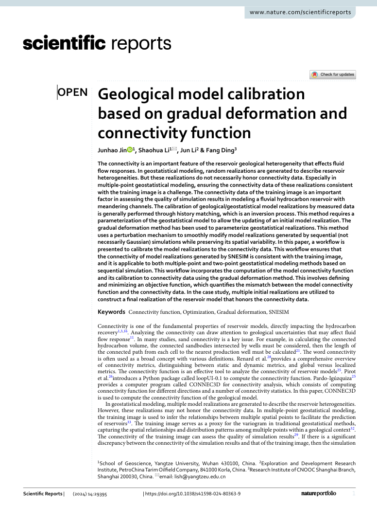地科公司李少华教授团队长期从事地质统计学建模的研究,团队成员金俊浩在《Scientific Reports》期刊上发表题为“Geological model calibration based on gradual deformation and connectivity function”的研究论文。英国365集团公司官网为论文第一署名单位,硕士研究生金俊浩为论文第一作者,其导师李少华教授为该文通讯作者。