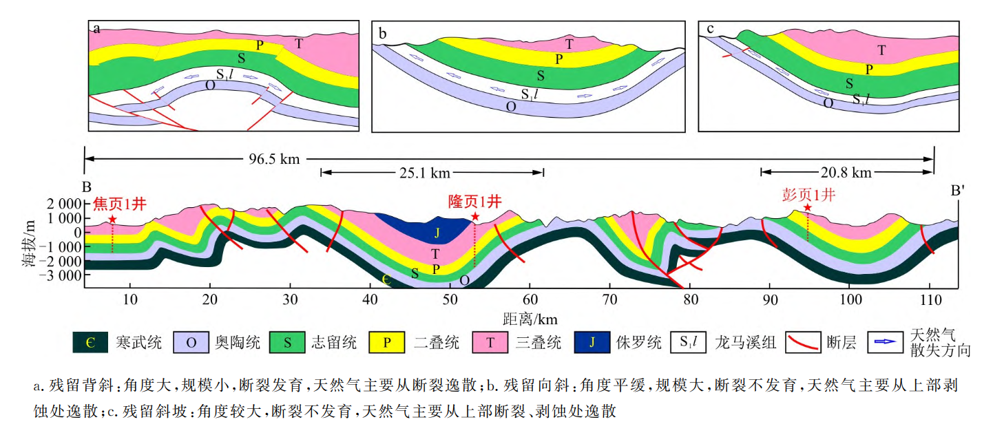 渝东南盆缘转换带处于构造变形强烈区域,相对于盆内五峰组-龙马溪组页岩气富集过程,需要对保存条件的评价提出更高的要求。论文针对渝东南盆缘转换带复杂的构造格局,通过对构造演化、抬升剥蚀、断裂发育、构造样式、顶底板条件、地层压力等多因素叠合分析,开展了保存条件的研究。结果表明,盆缘转换带抬升剥蚀严重,断裂发育,形成了一系列残留构造样式;距离剥蚀边界、大断层近的区域内,五峰组-龙马溪组均有天然气逸散的情况,地层压力系数普遍小于1.2;桑拓坪向斜、武隆向斜大断裂发育较少,五峰组-龙马溪组在远离剥蚀区具有良好的页岩气保存条件,推断后期抬升剥蚀和断裂发育是天然气散失后常压形成的主要原因;尽管由盆内向盆外地层压力系数由超压转变为常压,但构造形成了窄陡残留背斜、宽缓残留向斜和残留斜坡的页岩气保存形式。在确定保存条件影响因素基础上,建立了渝东南盆缘转换带常压页岩气保存条件的评价标准,划分了3类有利目标区。