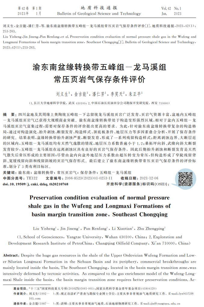 地科公司博士生刘义生在地质学领域期刊《地质科技通报》期刊发表题为“渝东南盆缘转换带五峰组-龙马溪组常压页岩气保存条件评价”的研究论文。英国365集团公司官网为论文第一署名单位,博士生刘义生为论文第一作者,金吉能副教授为通讯作者,该项研究得到了国家科技重大专项任务和国家自然科学青年基金的资助。