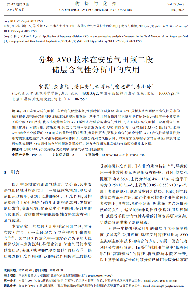 地科公司硕士生宋晨在地球物理领域期刊《物探与化探》期刊发表题为“分频AVO技术在安岳气田须二段储层含气性分析中的应用”的研究论文。英国365集团公司官网为论文第一署名单位,硕士生宋晨为论文第一作者,金吉能副教授为通讯作者。
