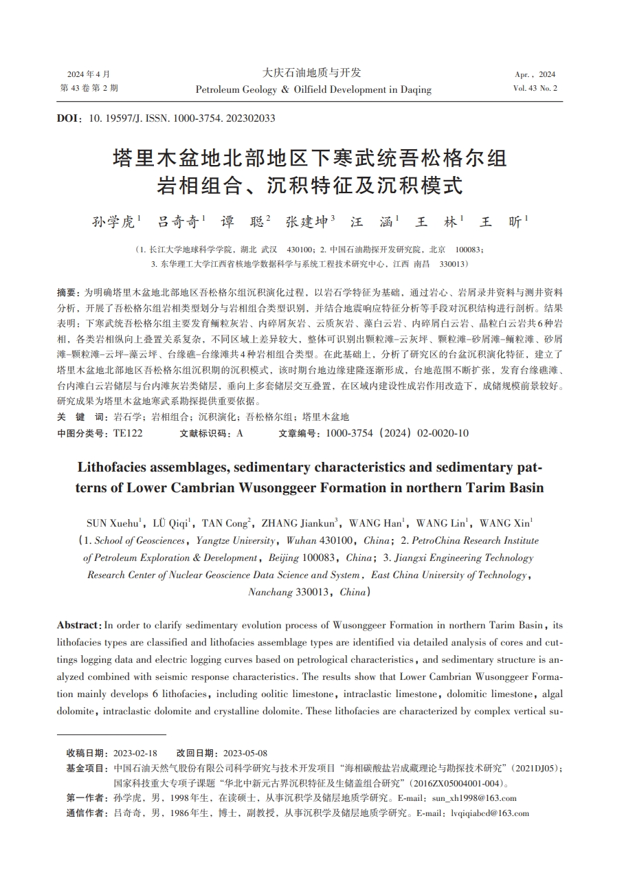 公司硕士生孙学虎在《大庆石油地质与开发》上发表了题为“塔里木盆地北部地区下寒武统吾松格尔组岩相组合、沉积特征及沉积模式”的研究论文,采用岩相学、沉积学的方法,分析了塔北地区下寒武统吾松格尔组沉积特征演化过程。英国365集团公司官网为论文第一署名单位,孙学虎为第一作者,导师吕奇奇副教授为通讯作者。
