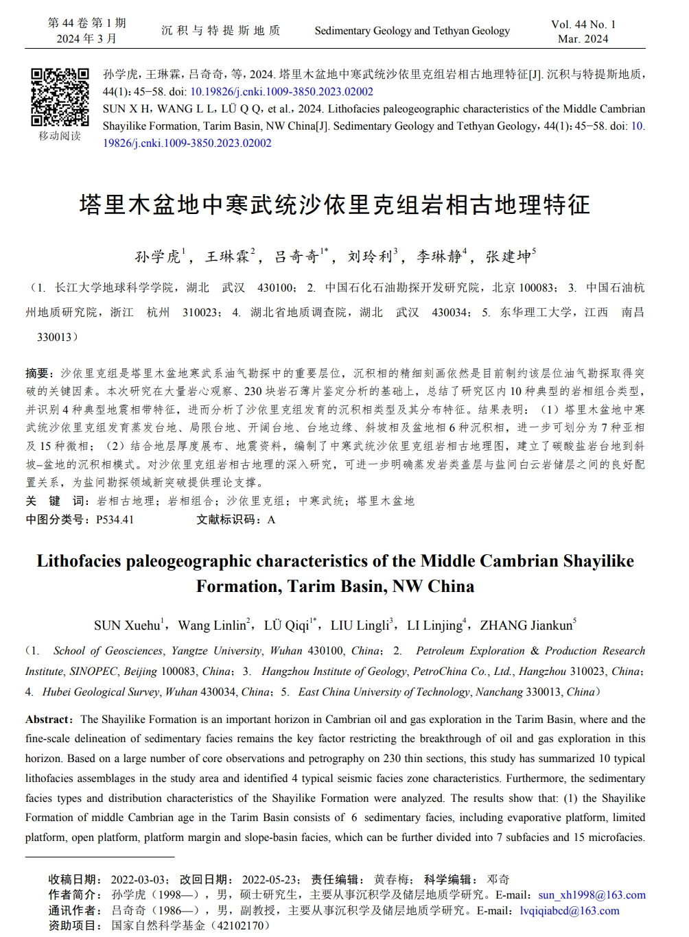 公司硕士生孙学虎在《沉积与特提斯地质》上发表了题为“塔里木盆地中寒武统沙依里克组岩相古地理特征”的研究论文,采用岩相学、沉积学的方法,分析了塔塔里木盆地沙依里克组岩相古地理过程。英国365集团公司官网为论文第一署名单位,孙学虎为第一作者,导师吕奇奇副教授为通讯作者。