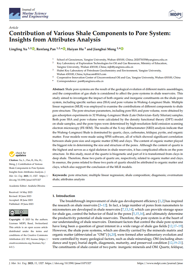 英国365集团公司官网石油系潘仁芳教授在海洋地质学领域主流期刊《Journal of Marine Science and Engineering》(JMSE)上发表题为“Contribution of Various Shale Components to Pore System: Insights from Attributes Analysis”的研究论文。