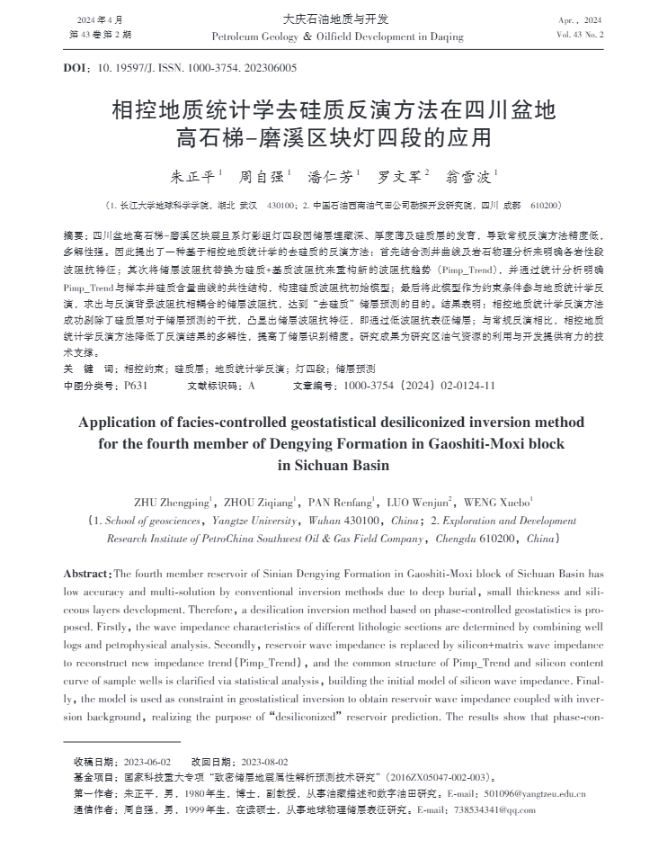 英国365集团公司官网地科系教师朱正平博士在石油地质学领域主流期刊《大庆石油与地质》上发表题为“相控地质统计学去硅质反演方法在四川盆地高石梯-磨溪区块灯四段的应用”的研究论文。