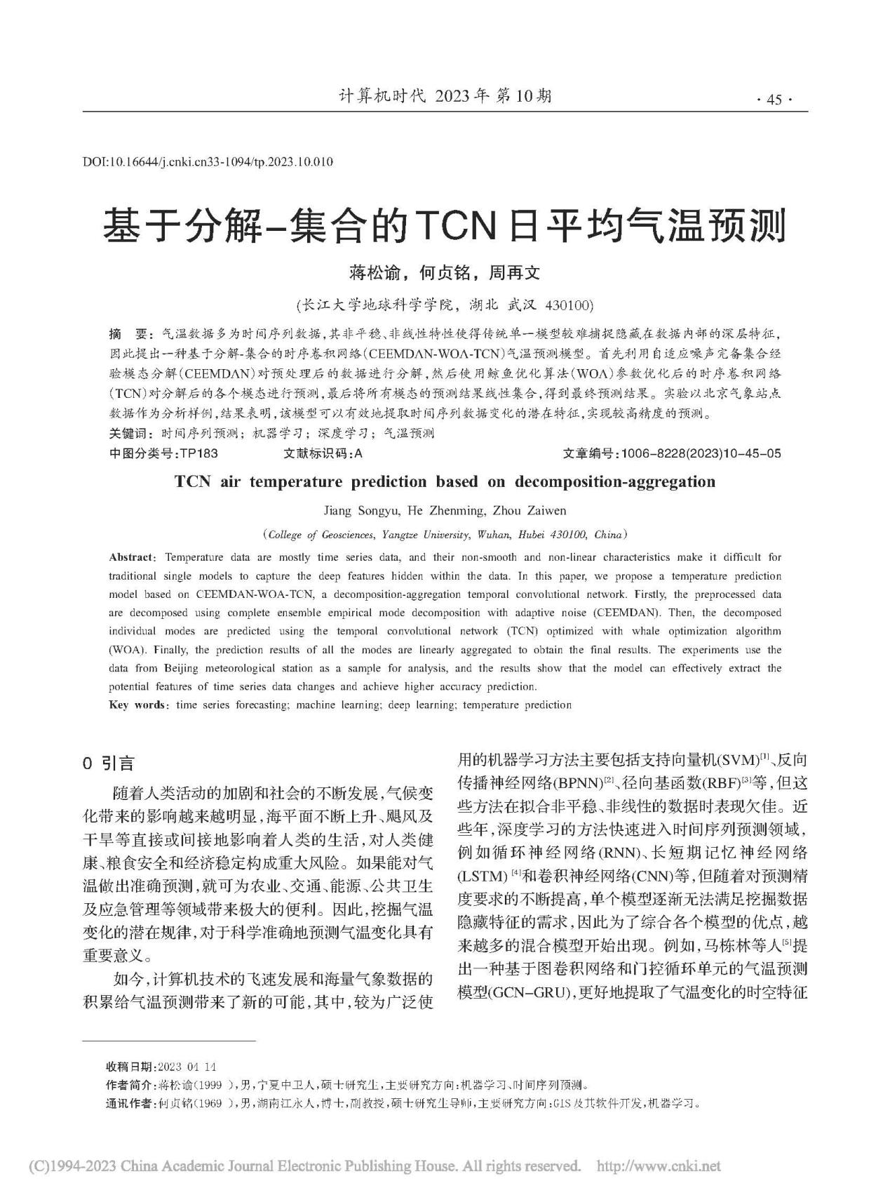 地科公司何贞铭副教授团队长期从事GIS、RS应用的研究,团队成员蒋松渝在期刊《计算机时代》上发表题为“基于分解-集合的TCN日平均气温预测”的研究论文。英国365集团公司官网为论文第一署名单位,硕士研究生蒋松渝为论文第一作者,其导师何贞铭副教授为该文通讯作者。