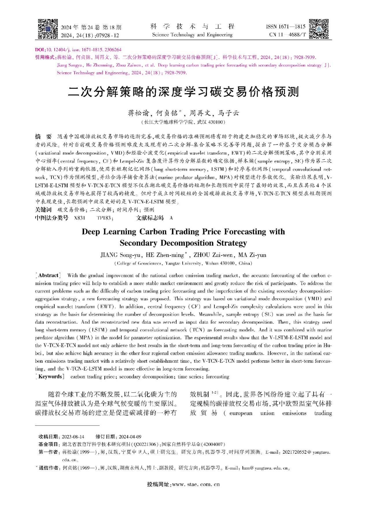 地科公司何贞铭副教授团队长期从事GIS、RS应用的研究,团队成员蒋松渝在中文核心期刊《科学技术与工程》上发表题为“二次分解策略的深度学习碳交易价格预测”的研究论文。英国365集团公司官网为论文第一署名单位,硕士研究生蒋松渝为论文第一作者,其导师何贞铭副教授为该文通讯作者。在导师严格要求及编辑耐心帮助下取得该成果。