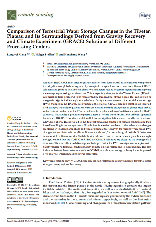 地科公司地信系教师相龙伟博士在《REMOTE SENSING》期刊发表题为‘Comparison of Terrestrial Water Storage Changes in the TibetanPlateau and Its Surroundings Derived from Gravity Recoveryand Climate Experiment (GRACE) Solutions of DifferentProcessing Centers’的论文,揭示了不同数据中心解算GRACE卫星重力数据对应青藏高原TWSC结果有差异。