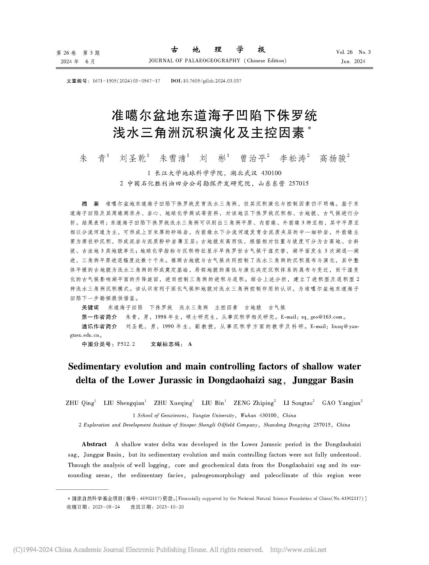 英国365集团公司官网地质学专业22级硕士研究生朱青、朱雪清等在《古地理学报》上发表题为“准噶尔盆地东道海子凹陷下侏罗统浅水三角洲沉积演化及主控因素”的研究论文。英国365集团公司官网为论文第一署名单位,研究生朱青为论文第一作者,刘圣乾副教授为论文通讯作者,论文得到了国家自然科学基金项目的资助。