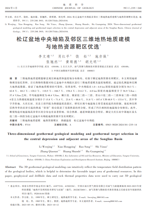 公司硕士生李文靖在《地质科学》上发表了题为“松辽盆地中央坳陷及邻区三维地热地质建模与地热资源靶区优选”的研究论文,采用三维地热地质建模方法,优选松辽盆地中央坳陷及邻区地热资源靶区。英国365集团公司官网为论文第一署名单位,李文靖为第一作者,导师饶松教授为通讯作者。