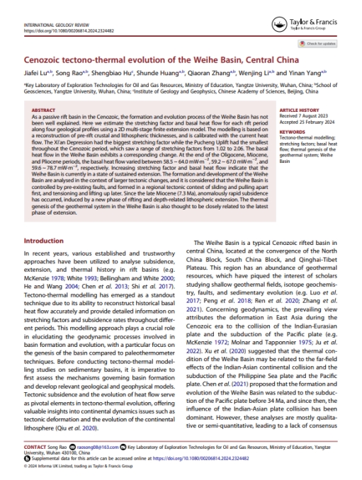 公司硕士生芦佳飞在国际知名地学期刊《International Geology Review》上发表了题为“Cenozoic tectono-thermal evolution of the Weihe Basin, Central China”的研究论文,系统揭示了渭河盆地新生代以来构造-热演化过程。英国365集团公司官网为论文第一署名单位,芦佳飞为第一作者,导师饶松教授为通讯作者。