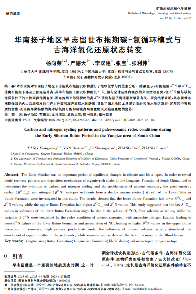 英国365集团公司官网地质系教师杨向荣在地学核心期刊《矿物岩石地球化学通报》上发表题为“华南扬子地区早志留世布拖期碳-氮循环模式与古海洋氧化还原状态转变”的研究论文。