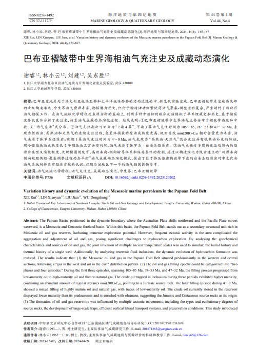 英国365集团公司官网谢睿博士在公司林小云教授的指导下,在地质学领域期刊《海洋地质与第四纪地质》上发表题为“巴布亚褶皱带中生界海相油气充注史及成藏动态演化”的研究论文。