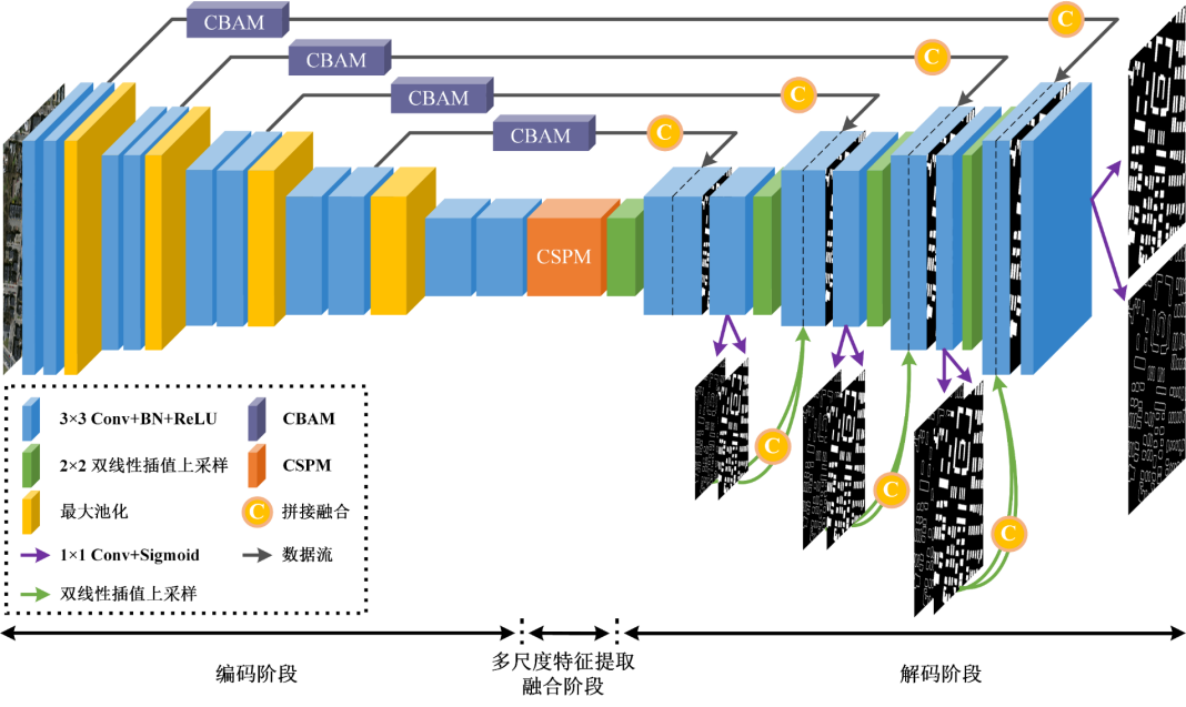 该研究主要针对现有全卷积神经网络因光谱混杂,造成建筑物漏检和误检,以及边界缺失的问题,因此,本文设计了一种基于多特征融合与对象边界联合约束网络的高分辨率遥感影像建筑物提取方法(图1)。所提方法基于编解码结构,并在编码阶段末端融入连续空洞空间金字塔模块,以在不损失过多有效信息的前提下进行多尺度特征提取和融合;在解码阶段,通过实现基于对象和边界的多输出融合约束结构,为网络融入更多准确的建筑物特征并细化边界;在编码与解码阶段间的横向跳级连接中引入卷积块注意力机制模块,以增强有效特征。此外,解码阶段的多层级输出结果还被用于构建分段多尺度加权损失函数,实现对网络参数的精细化更新。在WHU和Massachusetts建筑物数据集上进行对比试验分析,其中交并比(intersection over union, IoU)和F1分数分别达到了90.44%、94.98%和72.57%、84.10%,且模型的复杂度与效率均优于MFCNN与BRRNet(图2)。