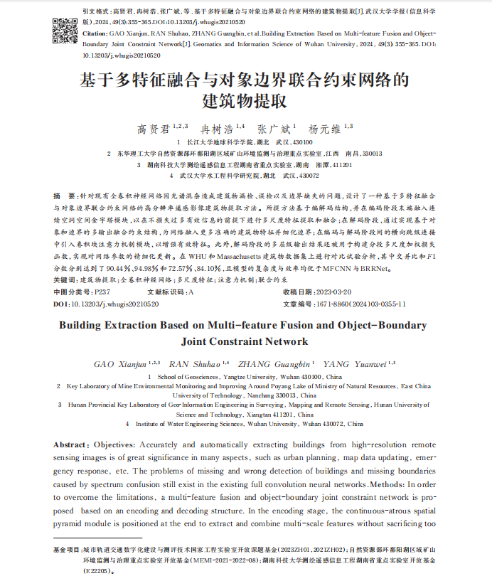 地科公司高贤君副教授在遥感领域主流期刊《武大学报》上发表题为“基于多特征融合与边界联合约束网络的建筑物提取”的研究论文。