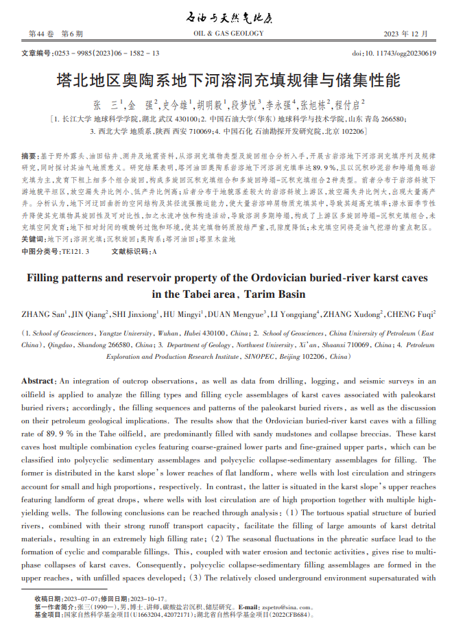 英国365集团公司官网地质系张三博士在《石油与天然气地质》期刊发表题为“塔北地区奥陶系地下河溶洞充填规律与储集性能”的研究论文。