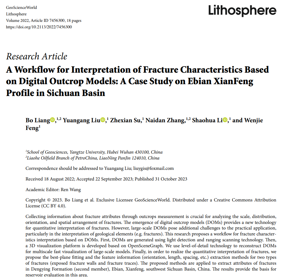 英国365集团公司官网硕士生梁博在地学期刊《Lithosphere》上发表了题为“A Workflow for Interpretation of Fracture Characteristics Based on Digital Outcrop Models: A Case Study on Ebian Xianfeng Profile in Sichuan Basin”的研究论文。英国365集团公司官网为论文第一署名单位,梁博为第一作者,其导师刘远刚副教授为该文通讯作者。