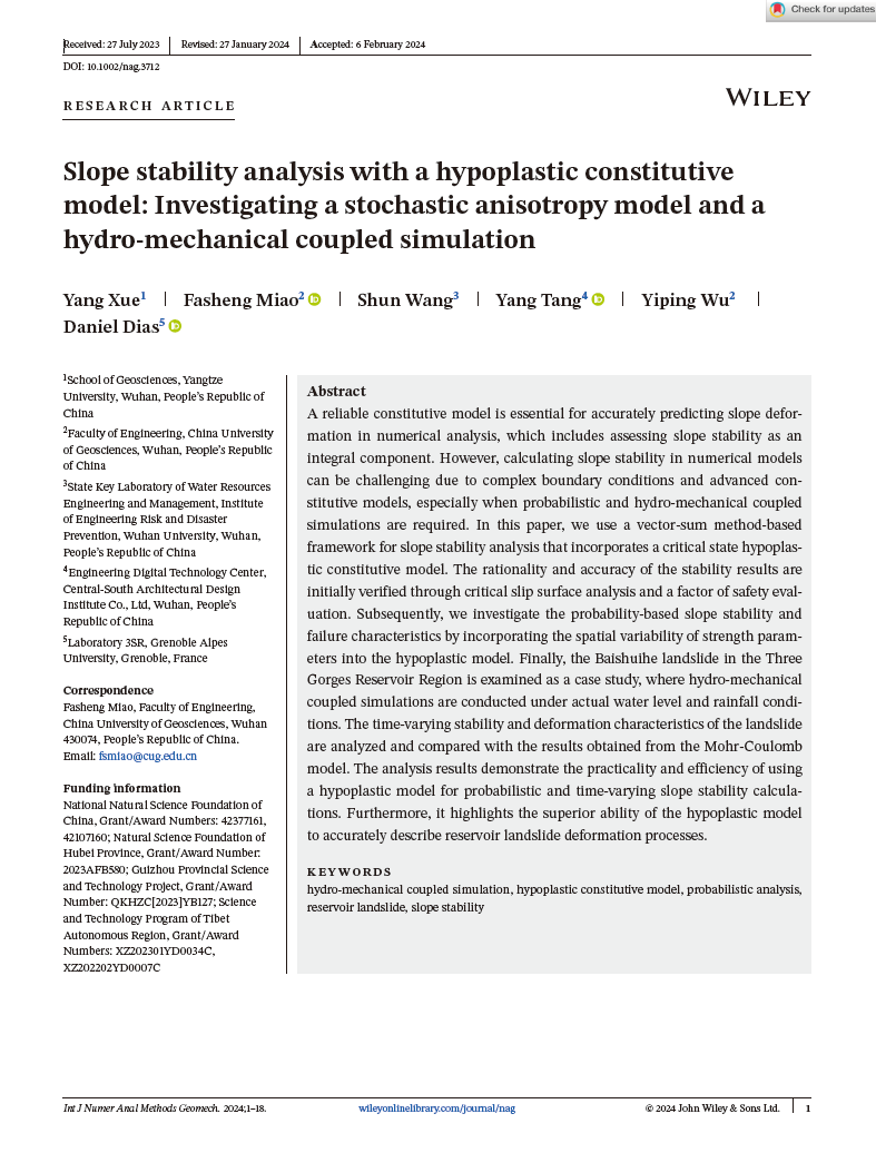 地科公司地质系教师薛阳博士以第一作者身份在计算机岩土领域老牌期刊《International Journal for Numerical and Analytical Methods in Geomechanics》上发表题为“Slope stability analysis with a hypoplastic constitutive model: investigating a stochastic anisotropy model and a hydro-mechanical coupled simulation”的论文。本项研究得到了国家自然科学基金项目和西藏自治区科技项目的资助。