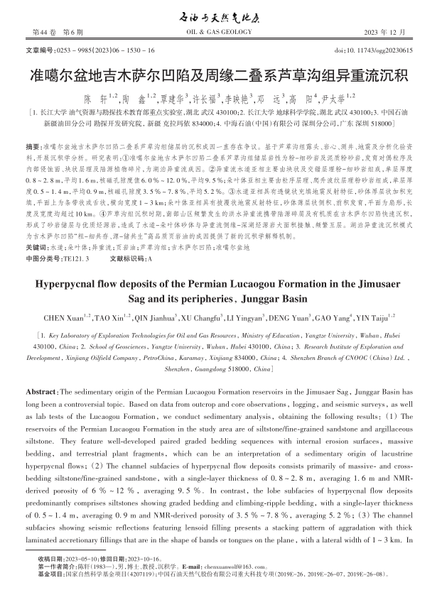 陈轩教授在《石油与天然气地质》期刊发表题目为“准噶尔盆地吉木萨尔凹陷及周缘二叠系芦草沟组异重流沉积”的研究论文。