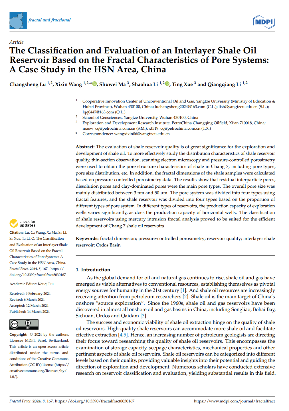英国365集团公司官网石油系王喜鑫博士在石油地质学领域主流期刊《Fractal and fractional》上发表题为“TheClassiffcationand Evaluation of an Interlayer Shale Oil Reservoir Based on the Fractal Characteristics of Pore Systems: A Case Study in the HSN Area, China”的研究论文。