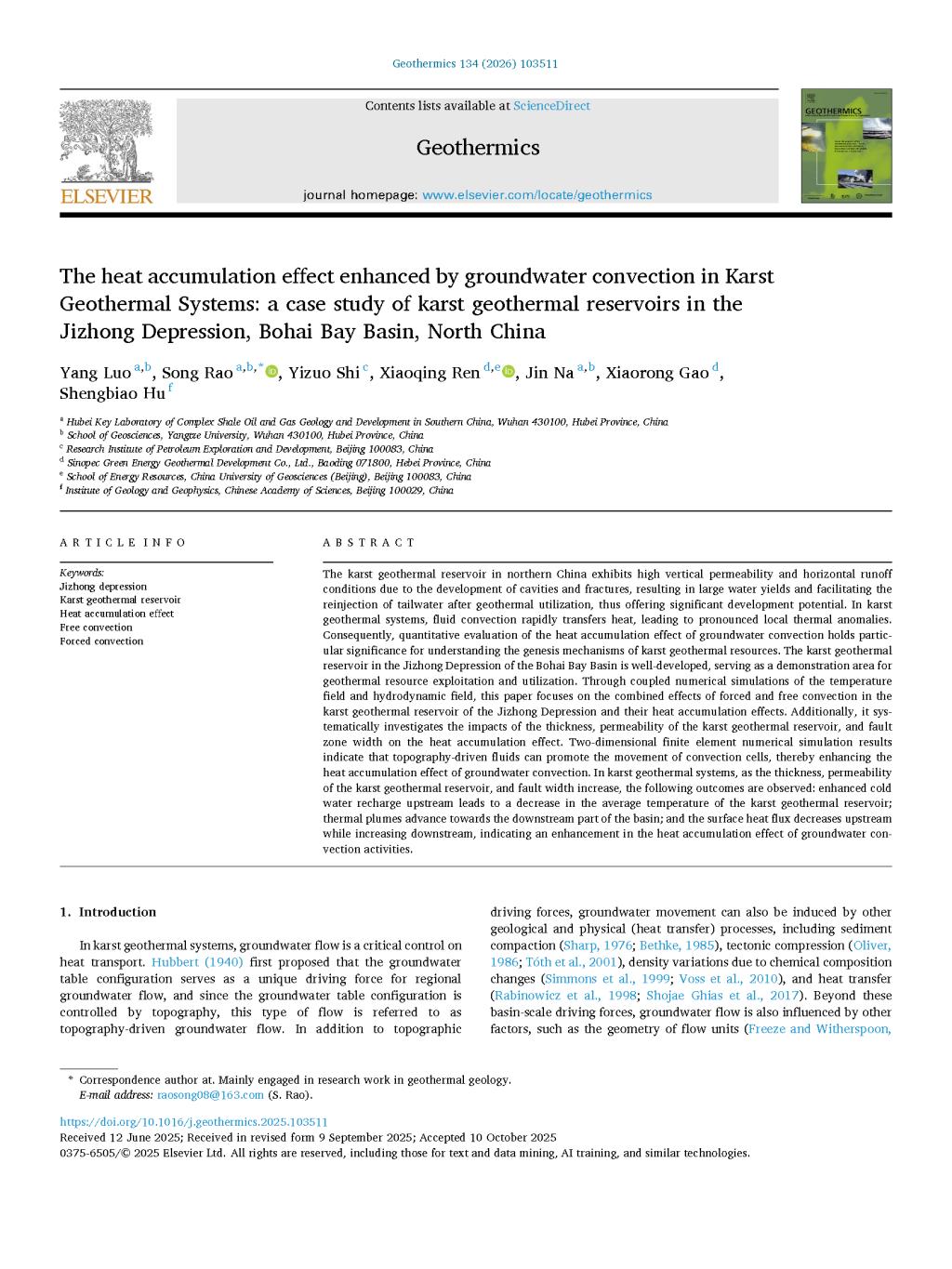 地科公司硕士生罗洋在饶松教授的指导下,在期刊《Geothermics》上发表题为“The heat accumulation effect enhanced by groundwater convection in karst geothermal systems: a case study of karst geothermal reservoirs in the jizhong depression, bohai bay basin, north China”的研究论文,英国365集团公司官网南方复杂页岩油气地质与开发湖北省重点实验室为论文第一署名单位,硕士生罗洋为论文第一作者,其导师饶松教授为该文通讯作者。