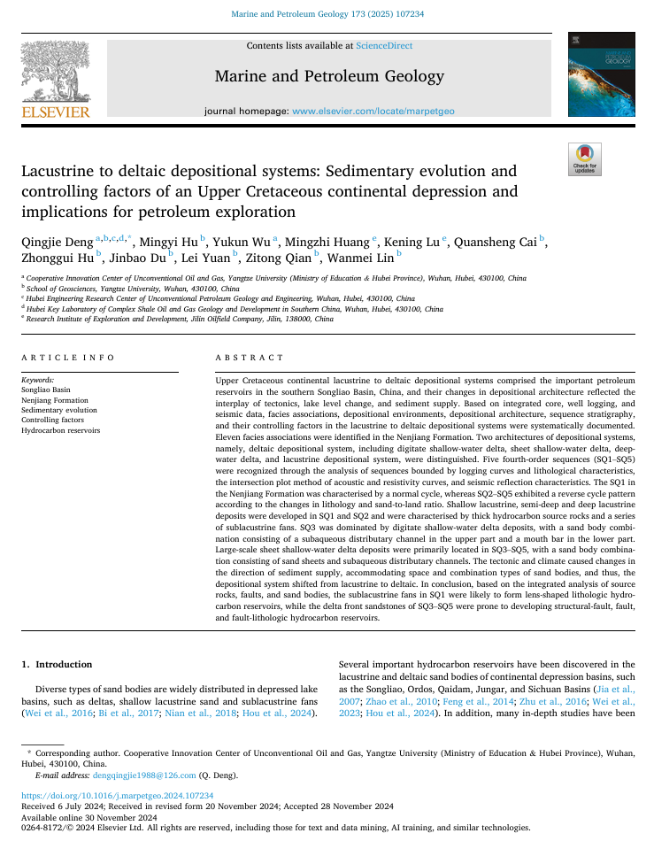 英国365集团公司官网邓庆杰副教授在《Marine and Petroleum Geology》发表题为“Lacustrine to deltaic depositional systems: Sedimentary evolution and controlling factors of an Upper Cretaceous continental depression and implications for petroleum exploration”的研究论文。邓庆杰为第一作者,英国365集团公司官网为第一完成单位(图1)。