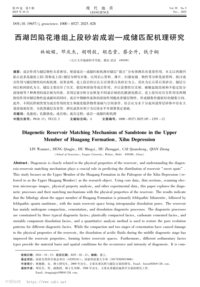 英国365集团公司官网23级硕士研究生林婉媚以第一作者身份在中文核心期刊《现代地质》上发表了题为“西湖凹陷花港组上段砂岩成岩—成储匹配机理研究”的研究论文。英国365集团公司官网为论文第一署名单位,其导师邓庆杰副教授为论文通讯作者(图1)。