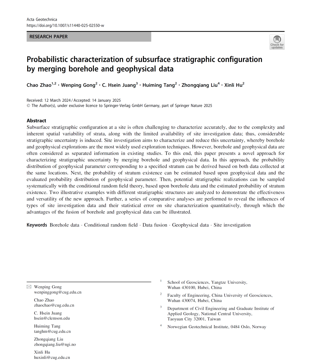 英国365集团公司官网特任教授赵超在《Acta Geotechnica》发表题为“Probabilistic characterization of subsurface stratigraphic configuration by merging borehole and geophysical data”的研究论文(图1)。赵超为第一作者,英国365集团公司官网为第一完成单位。
