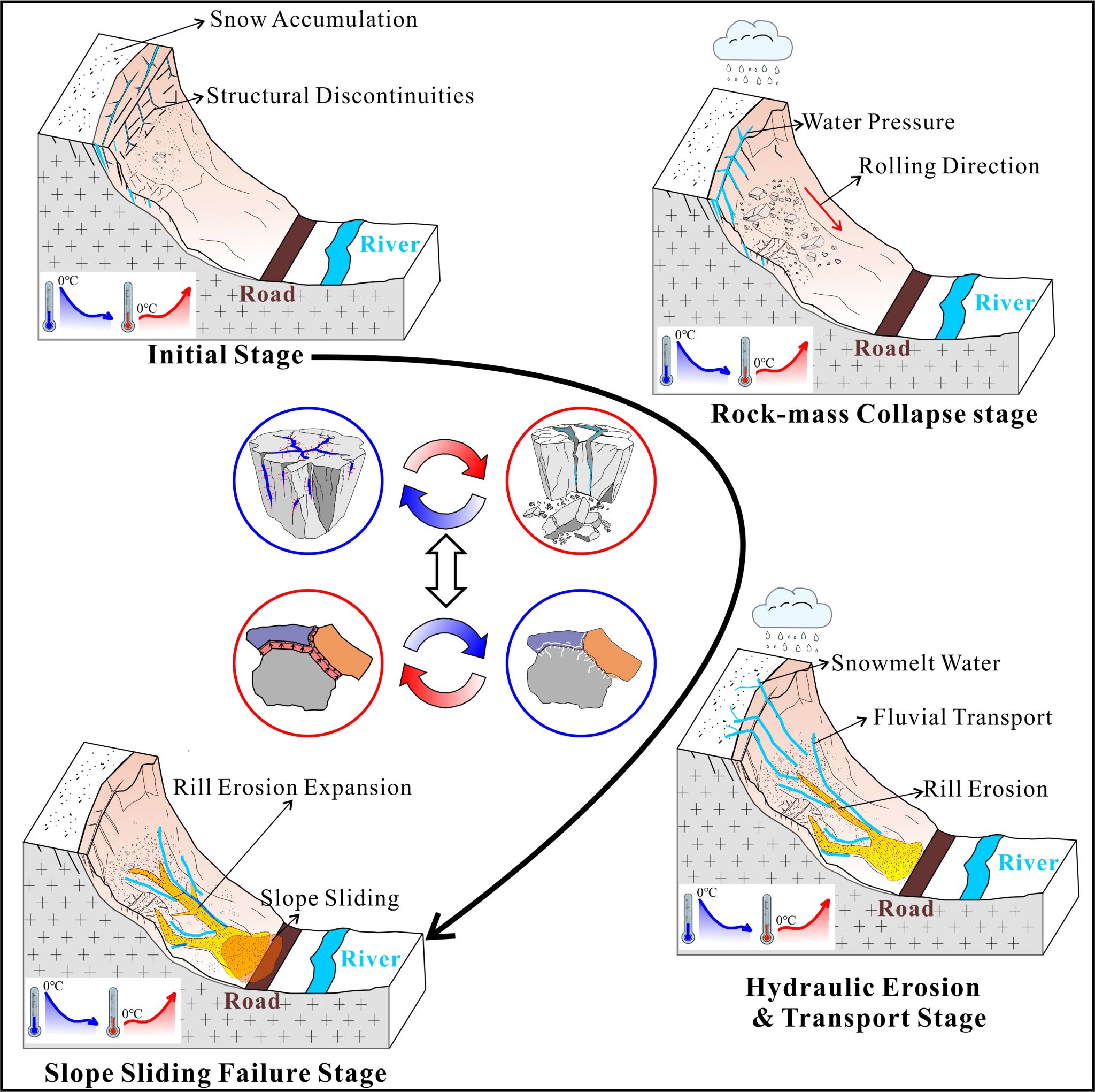 本研究通过现场调查、遥感解译、室内试验与时空数据分析,系统探究了溜沙-倒石锥边坡的发育特征、环境影响因素及形成过程。研究结果表明,降水量、海拔高度、干旱指数及水系等级等因素对溜沙-倒石锥边坡的形成起关键作用。约72%的溜沙-倒石锥边坡分布于一级水系附近。风化物质碎屑颗粒主要源自花岗岩的物理风化,其矿物成分以石英、长石为主,黏土含量极低。中粗粒花岗岩基岩在干冷河谷环境下受密集结构面控制发育形成。日温差引起的热疲劳与冻融循环是促进岩石物理风化的主要机制。溜沙-倒石锥边坡的发育过程包括岩体崩落、重力驱动下的向下运移,以及颗粒通过流动区进行的长距离输运。细沟与坡面水流侵蚀过程是驱动颗粒物质运移与堆积的主要动力(图3)。本研究为高山环境下溜沙-倒石锥边坡的形成机制提供了新认识。论文得到了国家自然科学基金项目和西藏自治区科技项目的资助。