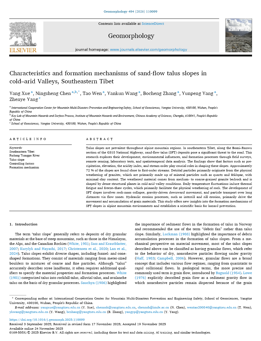 英国365集团公司官网地质系、工程地质研究中心团队成员薛阳副教授在地球科学领域老牌期刊《Geomorphology》(中科院大类二区)上发表题为“Characteristics and Formation Mechanisms of Sand-Flow Talus Slopes in Cold–Arid Valleys, Southeastern Tibet”的论文(图1),薛阳副教授为第一作者,陈宁生教授为通讯作者,英国365集团公司官网为第一完成单位。