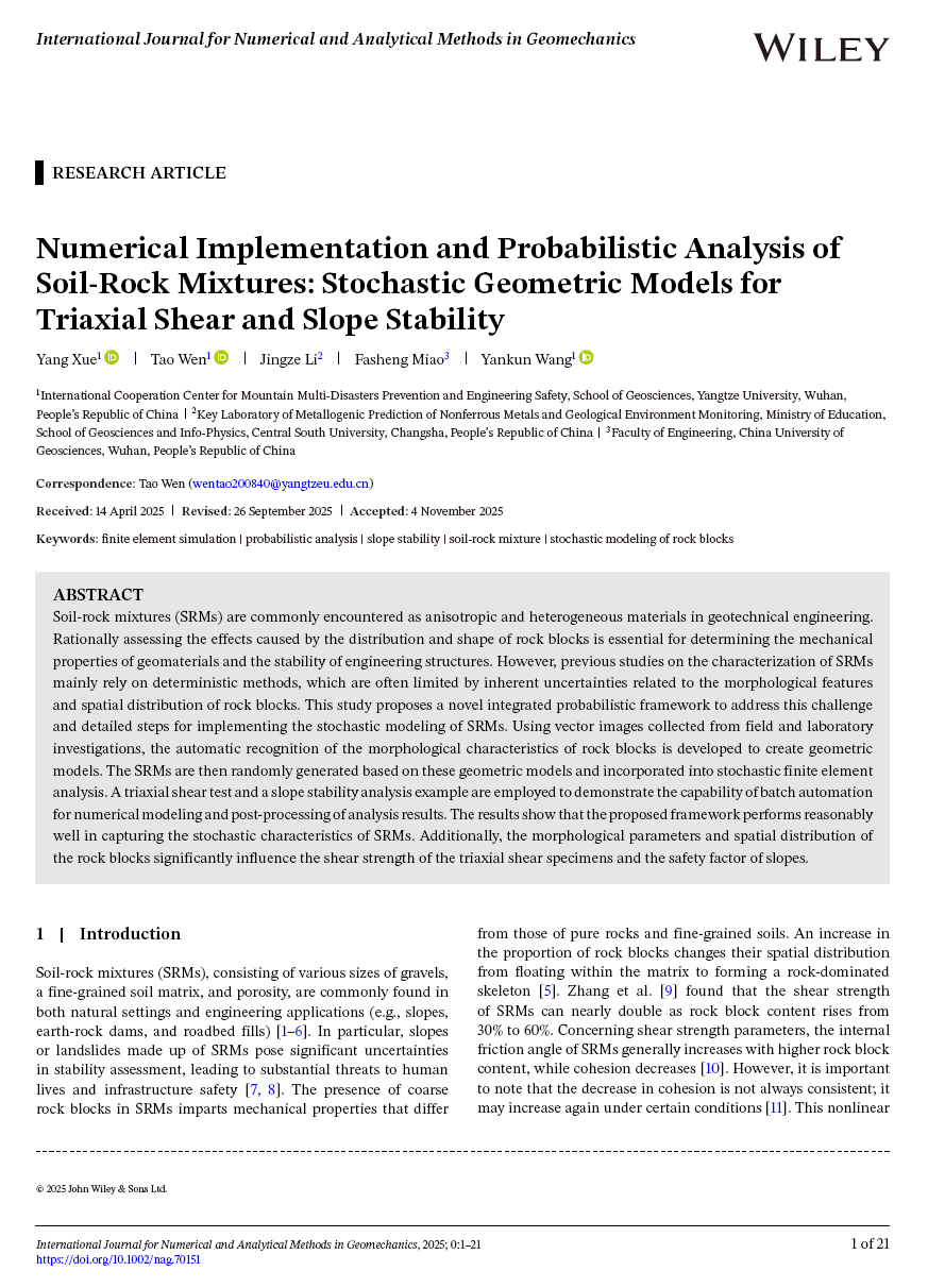 英国365集团公司官网地质系、工程地质研究中心团队成员薛阳副教授在老牌期刊《International Journal for Numerical and Analytical Methods in Geomechanics》(位列JCR分区一区,中科院大类二区)上发表题为“Numerical Implementation and Probabilistic Analysis of Soil-Rock Mixtures: Stochastic Geometric Models for Triaxial Shear and Slope Stability”的论文(图1),薛阳副教授为第一作者,温韬教授为通讯作者,英国365集团公司官网为第一完成单位。