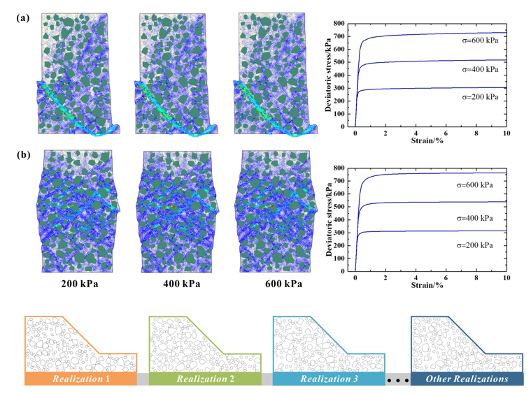 本研究针对此问题提出一种综合概率分析框架,详细阐述了土石混合体随机建模的具体实现步骤。首先,基于野外与室内调查获取的矢量图像,采用块石形态特征的自动识别技术以构建几何模型。然后,依据该几何模型随机生成土石混合体样本,并将其嵌入随机有限元分析体系中。通过三轴剪切试验与边坡稳定性分析案例(图2),验证了所提框架在批量化自动建模与结果后处理方面的能力。结果表明,该框架能有效捕捉土石混合体的随机特性。此外,块石的形态参数与空间分布对三轴试样的抗剪强度及边坡安全系数均具有显著影响。论文得到了国家自然科学基金项目和西藏自治区科技项目的资助。