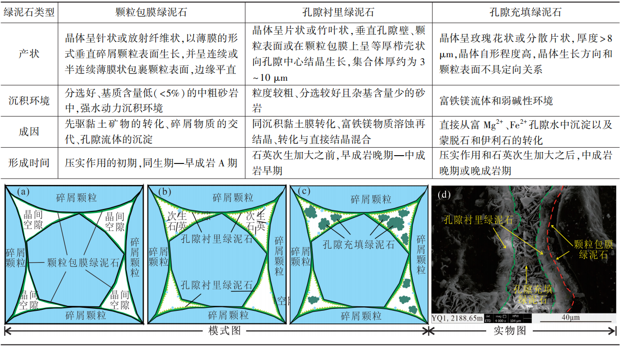 论文以绿泥石的产状、成因机制及其与成岩演化顺序为切入点,系统分析了三种绿泥石的形态及演化特征,绿泥石在储层中主要以颗粒包膜式、孔隙衬里和孔隙充填3种形式存在(图2),并从沉积环境与物质来源、流体性质等方面讨论了影响不同种类绿泥石发育的主控因素(图3)。