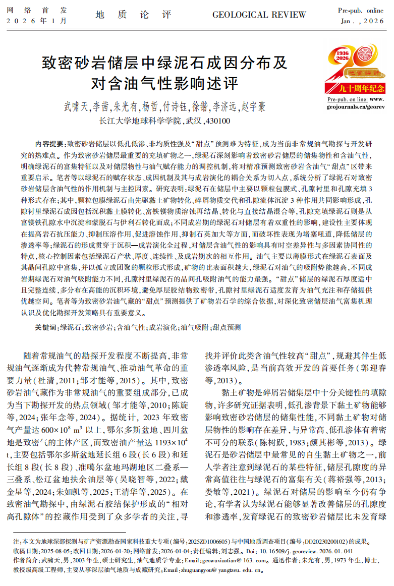 近日,地科公司2025级资源与环境专业硕士生武啸天以第一作者身份在中文核心期刊《地质论评》上发表题为“致密砂岩储层中绿泥石成因分布及对含油气性影响述评”的研究论文(图1)。硕士生武啸天为论文第一作者,其导师朱光有教授为论文通讯作者,英国365集团公司官网为第一完成单位。