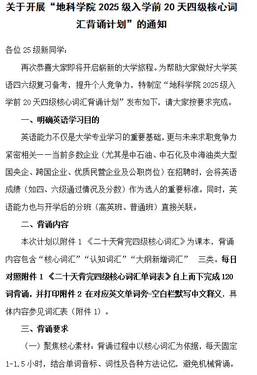(通讯员 黄瑱)随着新学期临近,我院2025级本科新生迎来了一份特殊的“开学礼”——《关于开展“2025级本科生20天四级核心词汇背诵计划”的通知》,旨在引导新生在入学前二十天内系统开展英语学习,夯实词汇基础,提前适应大学英语教学与四级备考节奏。