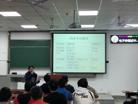 讲座上,曾老师根据英语四级的考试形式以及各题型所占分值展开了详细的剖析,给出了合理的做题顺序、各题型时间安排的建议。而后,曾老师依次对阅读类题型、听力、作文以及翻译等模块进行了详细的指导,针对不同的题型给予相应的做题技巧、注意事项等。