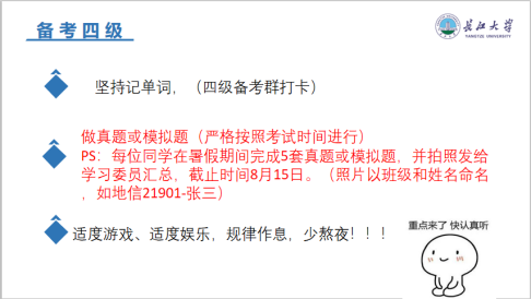 接下来是暑期英语四级备考部分,罗老师依次从考试的重要性、分值分布情况、四级考试相关流程和暑期备考安排四个方面展开。其中,她着重强调要重视单词的积累和真题、模拟题的检测,希望同学们抓住暑期时间,多积累单词、定期刷题,在备考过程中能够有效的巩固基础、熟悉四级题型,争取做好考前的最后冲刺。