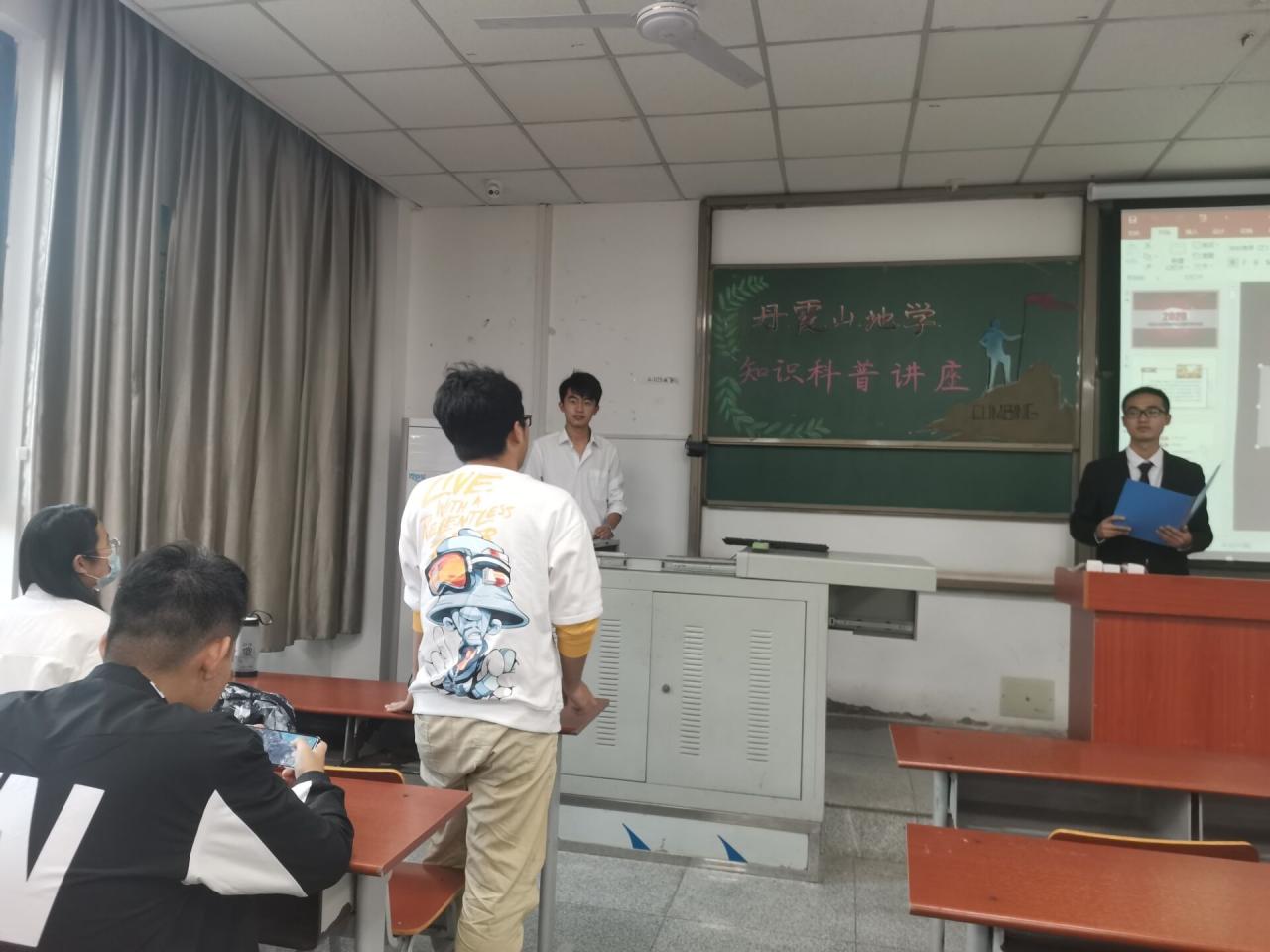 讲座开始,首先由主持人陈昱涵为我们简单介绍了主讲人徐明帅以及他所参加志愿活动的组织“脚爬客”。紧接着,徐明帅以两段简短的丹霞山视频开始了今天的演讲,这两段视频记录了他们在丹霞山科普学习生活的点点滴滴和丹霞山的美景,他根据自己的所见所学所感生动形象地讲述了丹霞山的地貌的特征以及形成过程。
